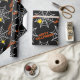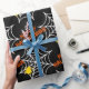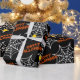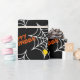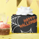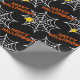 Den här coolan som är papper med spindelnät och spindlar på en svart bakgrund är perfekt för Halloween. Orange Happy halloween.