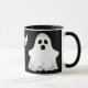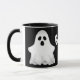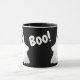 Det här är en bra mugg för Halloween. Bilden har ett vackert vitt spöke på en svart bakgrund med ord "Boo!" som kan anpassas eller lämnas som det är.