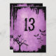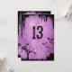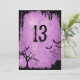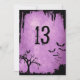 Halloween-bordskort med fladdermöss, kråka och träd mot en lila bakgrund med svart grunge-ram. Detta är perfekt för ett Halloween-bröllop eller Halloween-fest. Du kan ändra numret och lägga till det i din varukorg. Ändra sedan till nästa nummer och lägg till ett kort till i din varukorg. Så om du har tio bord lägger du till varje kort en gång med det nya numret tio gånger. Kortet matchar kollektionen i min butik som heter Halloween-bröllop med dödskalle, fladdermöss, spindel och spindelnät.