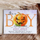 Halloween fick en barnduschinbjudan med jack-o-lantern. Baksidan av inbjudan har ett svart och vitt strippat mönster.