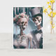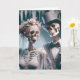 En skelettbrud och -groom är klädd i bröllop, med bruden i blommor och en slöja och brudgummen i top hat och bukslips