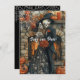 Halloween-kort med ett sött skelettpar som är klädda i deras finaste kläder. Bride bär en svart klänning med bilder av döskallar på den och har pumpor i håret. Groom bär ett svart kostym och pekade top hat. Det finns stora svarta spindlar som kryper runt medan ett Fladdermus hänger från manteln. Goth bröllopsinbjudan som kan anpassas efter dina behov i kostym.