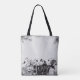 Halloween "Bus eller godis" Tote Bag. Svartvit, det ser ut som en gammal Halloween-teckning med spooky-dekoration med pumpor, fladdermus, flygande häxor, en svart katt och ett hemsökt hus. Det kan vara lätt att personlig med namn eller det budskap du vill ha.