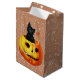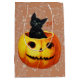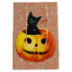 Halloween Cat i Pumpkin-presentpåsen med den söta lilla svarta katten sitta i en pumpa som säger "Boo!" på en Halloween-bakgrund mönster.