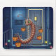 A whimsical centipede holds multiple jack-o'-lanterns, playfully illuminated on a house porch