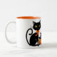 Kaffe mugg som visas i ett glupskt Halloween-svart katt och häxpumprat.