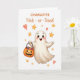 A cheerful little ghost floats happily with a pumpkin pail full of candy, surrounded by twinkling stars and playful hearts. This Halloween design is extra special with the option to add a personalized name on the front, making it a thoughtful choice for a daughter, niece, granddaughter, or any special girl you want to surprise. Inside, the sweet message brings smiles and giggles, celebrating the fun of the season with warmth and charm. A delightful keepsake for Halloween that feels both festive and personal.