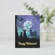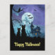 Ett sött Happy halloween-vykort av skämt svarta katter, fladdermus, uggla och ett hemsökt hus.