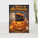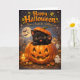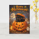 Illustrationen visar en söt svart kattunge som sticker ut ur en glödande jackolantern och viftar med en liten tass under en fullmåne i en magisk höstscen med vänliga små spöken som fladdrar med ljus och fladdermöss som flyger förbi. Det är det perfekta sättet att önskar vänner och familj en fantastisk högtid med sin varma sagoglöd och levande färger. Detta kort är en värdefull skatt som fångar all charm och magi från Halloween-natten.