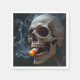 En dödskalle håller en bit majskorn i sina tänder och andas ut lekfulla rökar