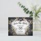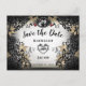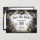 Halloween Elegante Spara vykortet för datum matchar inbjudan. Det här är ett tema för elegant underbart för ett Halloween-bröllop, har sken- och groomskelett, svart ro och ravens med bara en röd nyans. Enkel att anpassa texten.