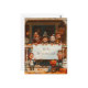 Det här är ett sött Halloween-vykort med en illustration av en familj med Halloween-kostymer sitta på porten. De håller en banderoll med anpassade.