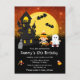 Denna roliga och skrämmande födelsedagsinbjudan har en söt häxa och ett spöke bredvid ett skevt spökhus. I bakgrunden syns en fullmåne med fladdermöss och en orange natt himmel med stjärnor. Texten kombinerar dekorativa och serifferade teckensnitt för en stilren och modern look. Detta är perfekt för Halloween.
