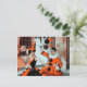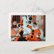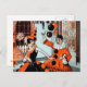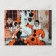 Vintage Halloween fest illustration i orange och svart med kvinna i häxans dräkt och en man i en clown costume