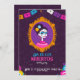 Flat inbjudan till dagen för de döda. Inbjudan med ett porträtt av en död flicka och med mexikanska färger och flaggor i tecknad stil.