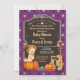 Cute Halloween-Bus eller godis-lilla pumprat med flicka-duschinbjudan med trevliga konstruktioner. Perfekt för Fall, Halloween-säsong. Hämta den här söta inbjudan nu! Tema: Halloween - bus eller godis. Stil: Vintage med en aning modern chic. Färg: Lila, guld, orange, svart. Grafik: pumpor, bocksäck, matriser, guld-stjärnor och styrbord (andra hudtoner och gender finns i butiken)