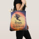 En häxa som flyger över himlar med ett happy halloween-meddelande. Den här designen ser ut att vara verkligen på den här Tote Bag