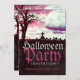 Död träd på kyrkogården med fåglar flygande över kyrkogården med rosa himmel -med halv molntäckt fullmåne lämplig för Halloween, gotisk födelsedag eller en speciell festinbjudan eller någon annan typ av tillfälle. All text är helt anpassningsbar..