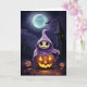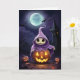 Detta är en nyfiken Halloween-temad illustration. Centrala figur är en söt, spöklik karaktär med ett skallliknande ansikte, som bär en lila täckmantel. Tecknet kommer från en stor, lysande jack-o-lantern som ger scenen en lekfull och god atmosfär. I bakgrunden finns det ett måne som lyser nattetid himlar, tillsammans med flygande fladdermus och ett skämt, krokigt hus med ljusfönster. Ytterligare jack-o'-lyktor och barren, tvinnat träd bidrar till bildens hemsökta, magiska känsla. Den övergripande tonen är lekfull men ändå uppseendeväckande och fångar Halloween-essensen.
