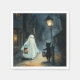 Halloween-scen med ett spöke- och kattmöte på gatan