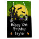 Den här roligten och den här skämtsamma presentpåsen kan vara personlig med ett namn eller en titel, som dotter, barndotter, brorson, brorson osv. Den har söta Frankensteinmonster bredvid ett korkat hemsökt hus. I bakgrunden finns ett fullt med fladdermus och en grönt kväll himlar med stjärnor. Texten kombinerar dekorativt och seriöst typsnitt för en snyggt och ett modernt utseende. Det här är perfekt för Halloween.