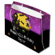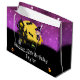Den här roligten och den här skämtsamma presentpåsen kan vara personlig med ett namn eller en titel, som dotter, barndotter, brorson, brorson osv. Den har en söt häxa bredvid ett hemsökt hus. I bakgrunden finns ett måne med fladdermus och en lila natt himlar med stjärnor. Texten kombinerar dekorativt och seriöst typsnitt för en snyggt och ett modernt utseende. Det här är perfekt för Halloween.
