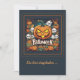 Digitales Design von einem großen Kürbis. Diese Kombination aus Kürbis, Grimasse und Halloween-Banner ist eine beliebte Dekoration während der Herbst- und Halloween-Zeit. Ein klassisches Symbol für die gruselige Jahreszeit.