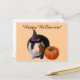 Ett bra vykort har en gris som bär en häxhatt och står vakt med en pumpa! Med "Happy halloween"-budskapet är detta ett underbart vykort som även skall sändas till gris och Halloween älskare.
