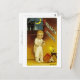 Vintage Halloween-hälsningskortillustration som visar ett viktoriskt barn som skräms av en svart katt i fönstret.