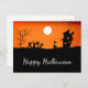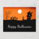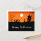 vykort i happy halloween Hälsning, med en svart och orange filmbild av en häxa och ett hemsökt hus. Med elegantens vita skripttypografi kan du lägga till en egen text. En söt vintage inspirerade kort att skicka din Halloween önskemål!