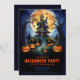 En inbjudan från Halloween fest med ett hemsökt hus på en backe med skrämmande glödande pumpor i förgrunden. Den skämtsamma atmosfär som mörken kväll skapat med måne, skrämmande träd, hus och glödande pumpor är perfektens sätt att ange tonen för ett Halloween fest. Denna Halloween-illustration är gjord i konstens vattenfärg och penna.