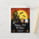 Detta roliga och skrämmande födelsedags kort kan anpassas med ett namn eller titel, till exempel dotter, sondotter, systerdotter, vän etc. Det visar en söt häxa och ett spöke bredvid ett skevt spökhus. I bakgrunden syns en fullmåne med fladdermöss och en orange natt himmel med stjärnor. Texten kombinerar dekorativa och serif-typsnitt för en stilren och modern look. Detta är perfekt för Halloween.