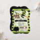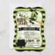 Onda bröllopsinbjudan! Söt, limegrön, svart, orange och vit Halloween tema bröllopsinbjudan på grön och svart randigt mönster. Innehåller grön och svart häxa som flyger på kvast och svart gryta med häxbräde. Perfekt för Oktober Halloween tema bröllopsfester! Vintage fästbracket-formad inbjudan.