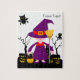 Den här produkten är perfekt för att fira Halloween med barn. Han har en häxdräkt och är redo att åka till bus eller godis med vänner. Hon är en mystisk häxa med pumpa. Den skapades med enkla geometriska former och färg med traditionell orange. Svart hemsökt hus i bakgrunden, vintern träd, uggla och fladdermöss.