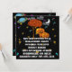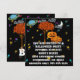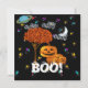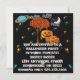Halloween-inbjudan med svart himmel, halvmåne, färgrik Saturnus, moln och många fler färgglada stjärnor. Söta pumpafamiljen står bredvid ett träd med orange höstlöv och ett stort BOO! Med ögon ovanpå bokstäverna som inbjuder dig till en trevlig men inte alltför skrämmande Halloween-skördefest. Perfekt för kyrkans Halloween-fest också!