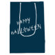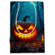 En skuren pumpkin med en olycksbådande flin glöd i en mörk, en rävskog med ett litet ljus i närheten