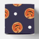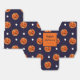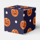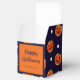 En utsökt utformning av anpassadet Halloween Favor box med en sockerkaka som illustrerar en orange jack o lantern-pumpa och vitt polka dots på mörk blått marin bakgrund.