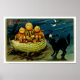 Vintage Halloween-hälsningskort illustration av en svart katt som "skämts" av Tre jack-o-Lantern Pumkins sitta på ett squash.