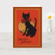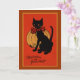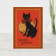 En svart katt som ha på sig en polka, pricker pilbågen och en stor pumpa på en orange bakgrund från en vintageHalloween vykort från 1912.