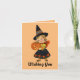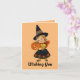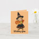 Cute, en vintage häxa som håller en pumpa, finns på detta Halloween-hälsningskort. Kortets framsida, läser, "Wishing You" och på insidan av kortet läser, "A Lycklig och Roligt Halloween"! Ett sött kort för att skicka ett barn till Halloween.