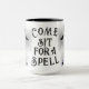 Kom SIT för en stavningskontroll eller Kom-SIP för en stavningskontroll. Kläder, hatt, skor och strimlade strumpor med lila virvlar damm omkring. Roligt och modern halloween eller mystiskt mugg.