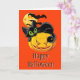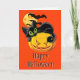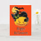 Ett hälsningskort som visas med en festlig Halloween-katt på en pumputskrift. Anpassa det här kortet eller köp som det är.