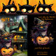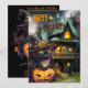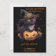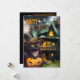 Ett roligt Halloween-kort med en katt som bär en häxhatt, med en pumpa framför ett spökhus med fladdermöss.