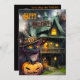 Ett roligt Halloween-kort med en katt som bär en häxhatt, med en pumpa framför ett spökhus med fladdermöss.