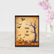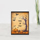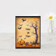 Vintage, bild av ett träd, fladdermöss och pumpor, pryder detta Halloween-kort. Framsidan av kortet har texten "Buss eller Godis" och insidan har texten "Det är dags. Ha kul på Halloween, men inte för läskigt. Grattis Halloween och ha en riktigt Glad Halloween!" Ett sött, men inte för läskigt kort att skicka till ett barn på Halloween!