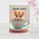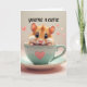 Denna bild visar en oemotståndligt söt, fluffig hamster som tittar ut från en ljus mintgrön tekopp med ett rosa hjärta på sidan. Hamstern har stora, blanka mörka ögon, rosiga kinder och små rosa tassar, med ett lyckligt och nyfiket uttryck. Små rosa hjärtan svävar runt tekoppen mot en mjuk, ljus rosa bakgrund, vilket förstärker det söta och bedårande temat.