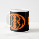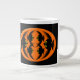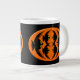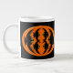 Fantastisk mugg har en orange oval med sex kråkor. Varje kråka har gult ögon med svarta elever och utsträckt vingar. Kråkorna flyger mot varandra och bildar en ovalform. Bakgrunden är svart.