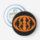 Den här flaska-knappöppnaren i fantastisk har en orange oval med sex kråkor. Varje kråka har gult ögon med svarta elever och utsträckt vingar. Kråkorna flyger mot varandra och bildar en ovalform. Bakgrunden är svart.