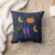 Cute och whimsical Halloween-plågade kuddar med katt, måne, pumpor, stjärnor, häxans ben och stövlar, och en kauldron med bubblande grönt bubblor, naturligtvis! Mönster skapat av Lavender Mint Graphics. Ingenting är AI-genererat.