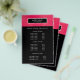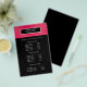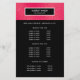 Glansig och stilren flygbladdesign visar dina tjänster, prislista eller företagsinformation över en digital bild av ett rasmberry rosa metalliskt glittermönster. Svart rand överst.